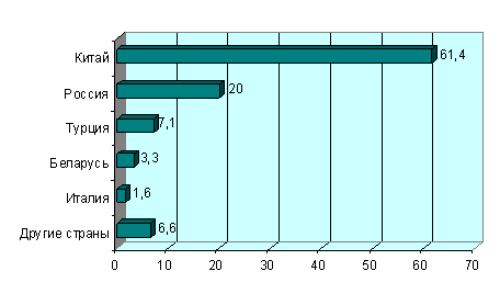 В настоящее время по объемам произведенной обуви на российском рынке лидирующие позиции занимает Китай. Если два-три года назад доля безмарочной китайской обуви на российском рынке составляла около 85%, то теперь, по оценкам электронного журнала Allshoes.ru, она снизилась примерно до 60% (диаграмма 2). При этом, участники рынка не афишируют наличие китайского производства, а если и говорят о нем, то усиленно подчеркивают степень контроля за качеством продукции. Необходимо отметить, что с учетом "серого" оборота доля китайской продукции на российском рынке обуви возрастет (по материалам обзора электронного журнала "Allshoes.ru - Все про обувь" и статьи "Рынок наизнанку", Екатерина Алябьева, "Эксперт Северо-Запад" №11 (264) /20 марта 2006,).