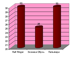 По данным диаграммы 3 видно, что объем рынка обуви в последние годы растет. Средний ежегодный прирост рынка в натуральном выражении составляет 12-15%, у компаний-лидеров - 20-30% (по материалам http://www.atlant.ru/opt/stati_2418. htm). Так, темп роста оборота компании "Эконика-обувь" составил 25%, Ralf ringer и "Пальмира" - по 30% (диаграмма 4).