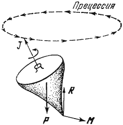 Рис. 1. Прецессия вращающегося волчка. J – момент импульса, Р – сила тяжести, R – реакция опоры, М – вращающий момент.