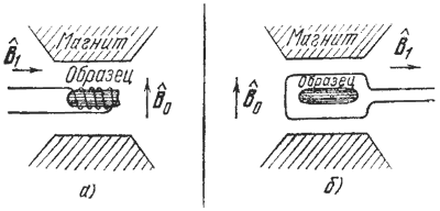 Рис. 2. Схематическое изображение установки для эксперимента по магнитному резонансу. Резонанс достигается в радиочастотном диапазоне. Катушка (а) и резонатор (б) присоединяются к источникам переменного поля и измерителям потери мощности.