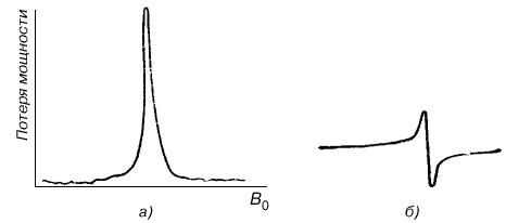 Рис. 3. Сигналы магнитного резонанса протона в жидком водороде а) Потеря мощности, б) Компонента М, находящаяся в фазе с поперечным полем.