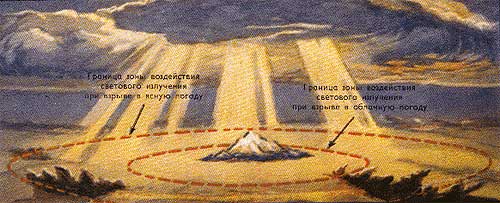 Световое излучение — это поток лучистой энергии, включающий ультрафиолетовую, видимую и инфракрасную области спектра. Источником светового излучения является светящаяся область взрыва — нагретые до высоких температур и испарившиеся части боеприпаса, окружающего грунта и воздуха. При воздушном взрыве светящаяся область представляет собой шар, при наземном — полусферу.