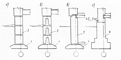 б)столбчатые или отдельно стоящие, представляющие собой ряд отдельных опор, устанавливаемых под стойками или колоннами, а также под стенами, опертыми на фундаментные балки (рис.2)