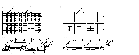Первый состоит из плиты, второстепенных и главных балок. На рисунке балки (или ребра) направлены вниз; при необходимости получить гладкий потолок устраивают перекрытие ребрами вверх, что менее экономично, так как площадь поперечного сечения верхней сжатой зоны уменьшена. Кессонированное перекрытие получают при пересечении равномерно расположенных в двух направленииях ребер одной высоты; его применяют из эстетических соображений в интерьерах обшественных зданий, а также как средство облегчения собственной