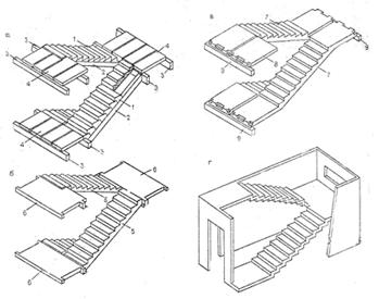 а – отдельные ступени; косоуры, балки и плиты; б – марши и площадки; в – марши с полуплощадками; г – объемный блок лестничной клетки: 1 — ступени; 2 — косоуры; 3 — балки; 4 — плиты; 5 — марши; 6 — площадки; 7 — марш с полуплощадкой; 8 – дополнительная полуплощадка; 9 — ригель