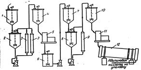 Рис.4. Периодическая схема выделения адипиновой кислоты: 1-приемный сборник; 2,8- кристаллизаторы; 3,9- холодильники; 4,7,10 – буферные сборники; 5,11 –центрифуги; 6- сборник-растворитель; 12- сушильный барабан.