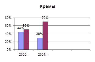 В течение года существенно изменилась структура ассортимента исследуемых косметических товаров по их происхождению. В начале 2000 г. отмечалось различное соотношение в структуре у разных наименований продукции: большую долю шампуней составляла импортная продукция (72%), а на долю импортных кремов приходилось менее половины ассортимента (44%). В течение года наблюдалась общая тенденция снижения доли импортных косметических товаров, в результате чего соотношение в структуре ассортимента шампуней и кремов стало примерно одинаковым — 38 и 30% соответственно (данная динамика представлена на рисунке 2.1.).