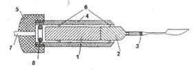 Конструкция акустического узла приведена на рисунке 5. Магнитостриктор 1 с приклеенным к нему концентратором 2 образует акустическую головку, которая с помощью демпфирующих резиновых колец 6 закрепляется в цилиндрическом кожухе 4.