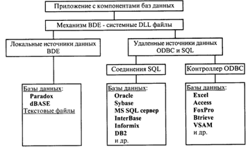 Ключевой механизм BDE (Borland Database Engine), обеспечивающий работу визуальных компонент баз данных, действует как интерфейс между вашим приложением и самой базой данных. BDE реализован в виде набора системных DLL файлов. Взаимодействие компонентных объектов с BDE никак не специфицирует конкретную базу данных и не зависит от реализации обмена информацией на нижнем уровне иерархии. Именно BDE обращается в свою очередь к драйверам, специфическим для базы данных указанного типа, возвращая вашему приложению запрошенные фактические данные. BDE играет роль, аналогичную контроллеру драйверов ODBC (Open Database Connectivity) производства фирмы Microsoft, изолируя приложения от нижнего уровня взаимодействия с базой данных и увеличивая общую производительность связи за счет использования кэш-памяти. Используя BDE, вы получаете доступ ко всем локальным стандартным базам данных вашего компьютера, к источникам данных ODBC и к SQL серверам баз данных в архитектуре сетевой связи клиент/сервер.
