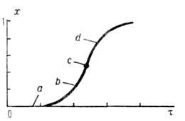 Для кинетич. кривой автокаталитич. р-ции характерны (см. рис.): период индукции а, когда р-ция протекает очень медленно; восходящая ветвь b, соответствующая увеличению скорости р-ции