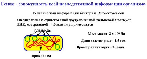 Все, что бактерия умеет делать кодируется ее генетическим аппаратом. То есть восприятие сигналов из внешней среды зависит от того, какие рецепторы находятся на мембране клетки, а рецепторы кодируются бактериальной ДНК. На примере кишечной палочки рассмотрим, как устроен геном бактерии. Геном – это совокупность всей наследственной информации. У кишечной палочки дуцепочечная ДНК замкнута в кольцо. Это кольцевая молекула состоящит из 4,6 млн пар нуклеотидов, что соответствует молекулярной массе 3 х 106 Да. Длина молекулы составляет порядка 1.5 мм. Время репликации этой молекулы 20 мин. Есть бактерии, которые размножаются медленнее, чем кишечная палочка.