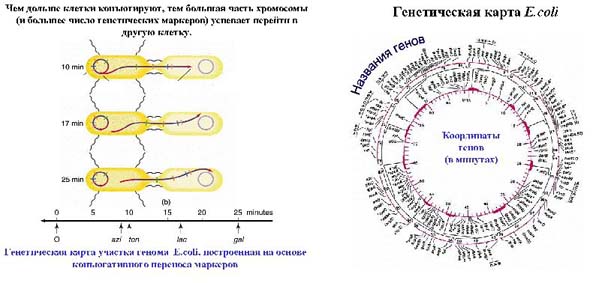 По этим данным строили генетическую карту (расположение друг относительно друга генетических маркеров). Генетическая карта кишечной палочки была построена в 60-х годах. На этой карте были гены-маркеры, расположенные по всей кольцевой хромосоме, а координаты генов на карте обозначались в минутах. Итоговая карта, построенная в 60-х годах, имела координаты в промежутке от 0 до 90 минут. Поэтому один известный микробиолог шутил, что кишечная палочка – это удивительный организм, у которой жизнь длится 20 минут, а половой процесс – 90 минут.