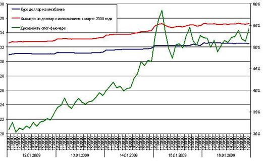 Рис. 2.5 Динаміка ф’ючерсних операцій та операцій «спот» на долар у 2009 році