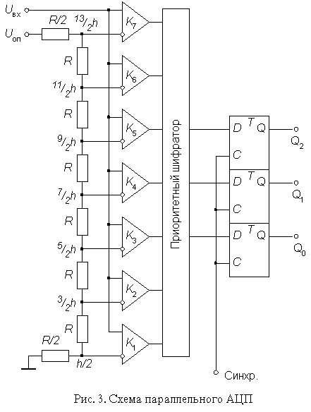 АЦП этого типа осуществляют квантование сигнала одновременно с помощью набора компараторов, включенных параллельно источнику входного сигнала. На рис. 3 показана реализация параллельного метода АЦ-преобразования для 3-разрядного числа.