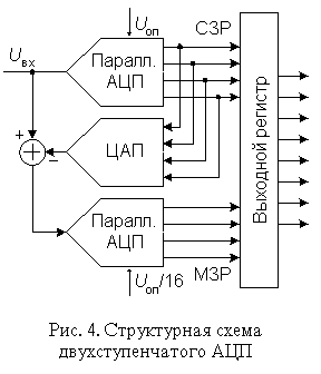В многоступенчатом АЦП процесс преобразования входного сигнала разделен в пространстве. В качестве примера на рис. 4 представлена схема двухступенчатого 8-разрядного АЦП.