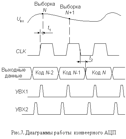 Сигналы выборки, формируемые из тактового сигнала, поступают на УВХ1 и УВХ2 в разные моменты времени (рис. 7). УВХ2 переводится в режим хранения позже, чем УВХ1 на время, равное суммарной задержке распространения сигнала по АЦП1 и ЦАП. Задний фронт тактового сигнала управляет записью кодов в D-триггеры и выходной регистр. Полная обработка входного сигнала занимает около двух периодов CLK, но частота появления новых значений выходного кода равна частоте тактового сигнала.