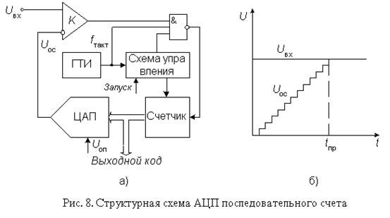 Этот преобразователь является типичным примером последовательных АЦП с единичными приближениями и состоит из компаратора, счетчика и ЦАП (рис. 8). На один вход компаратора поступает входной сигнал, а на другой - сигнал обратной связи с ЦАП.