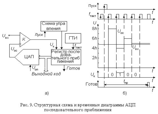 Рассмотрим принципы построения и работы АЦП последовательного приближения на примере классической структуры (рис. 9а) 4-разрядного преобразователя, состоящего из трех основных узлов: компаратора, регистра последовательного приближения (РПП) и ЦАП.