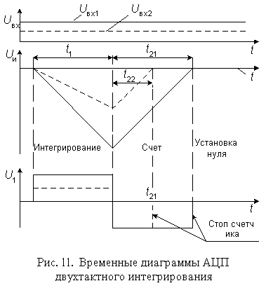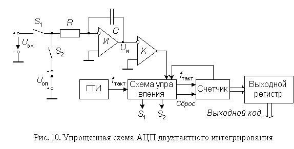 Упрощенная схема АЦП, работающего в два основных такта (АЦП двухтактного интегрирования), приведена на рис. 10.