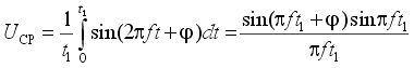 Определим коэффициент передачи помехи Кп для АЦП двухтактного интегрирования. Пусть на вход интегратора поступает гармонический сигнал единичной амплитуды частотой f с произвольной начальной фазой j. Среднее значение этого сигнала за время интегрирования t1 равно (11)