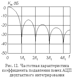 Из (12) следует, что переменное напряжение, период которого в целое число раз меньше t1, подавляется совершенно (рис. 12). Поэтому целесообразно выбрать тактовую частоту такой, чтобы произведение Kсч fтакт было бы равным, или кратным периоду напряжения промышленной сети.