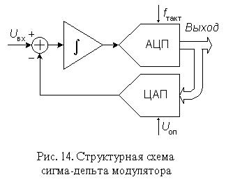 Основные узлы АЦП - это сигма-дельта модулятор и цифровой фильтр. Схема n-разрядного сигма-дельта модулятора первого порядка приведена на рис. 14. Работа этой схемы основана на вычитании из входного сигнала Uвх(t) величины сигнала на выходе ЦАП, полученной на предыдущем такте работы схемы. Полученная разность интегрируется, а затем преобразуется в код параллельным АЦП невысокой разрядности. Последовательность кодов поступает на цифровой фильтр нижних частот.