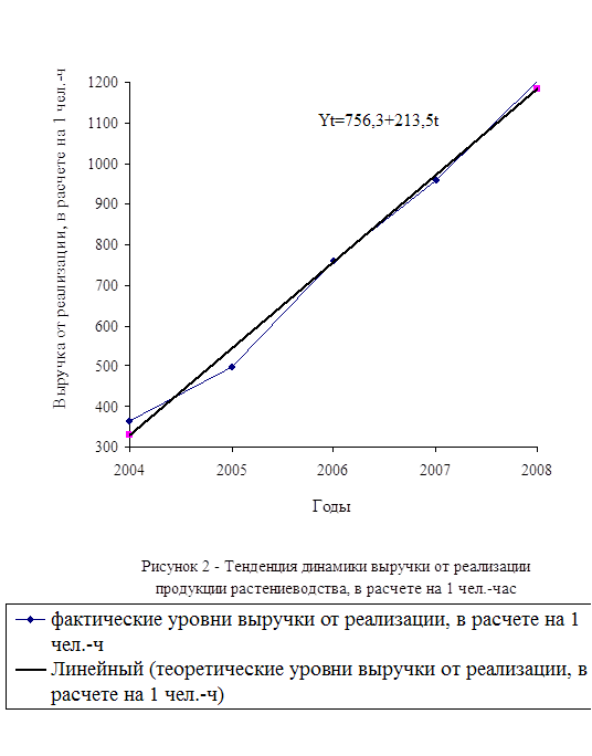 В период с 2004 по 2008 год выручка от реализации продукции растениеводства, приходящейся на 1 чел.-ч в хозяйстве в среднем составила 756,3 тыс. руб. Наблюдается тенденция к повышению выручки в среднем на 213,5 тыс. руб.