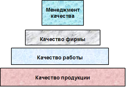 Как показывают С. Д. Ильенкова и др., наверху пирамиды находится TQM – всеохватывающий, тотальный менеджмент качества, который предполагает высокое качество всей работы для достижения требуемого качества продукции. Прежде всего, это работа, связанная с обеспечением