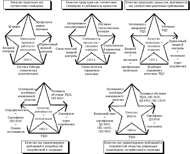 В истории развития документированных систем качества, мотивации, обучения и партнерских отношений можно выделить пять этапов и представить их в виде пяти звезд качества (рис. 2.).