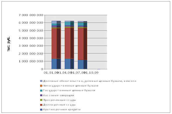 Объем краткосрочного кредитования составил 1 373 137 412 тыс. руб. на 01.01.09 г. и 1 352 490 512 тыс. руб. на 01.04.09 г., 1 187 741 501 тыс. руб. на 01.07.09 г.