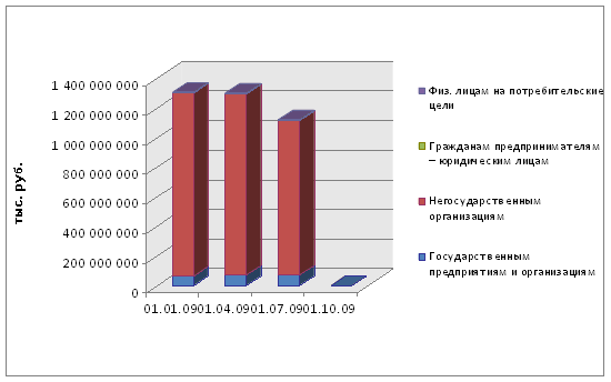 Основную долю (90,2% на 01.01.09 г., 90,6% на 01.04.09г. и 88,1% на 01.07.09 г.) в группе краткосрочных кредитов занимают краткосрочные кредиты, выданные негосударственным организациям. Несмотря на снижение удельного веса данного показателя в общей величине выданных краткосрочных кредитов, в абсолютных величинах динамика его неоднозначна, при этом удельный вес данного показателя в совокупных активах сокращается с 90,2% до 88,1%. Изменение данного показателя во многом предопределило изменение общего объема выданных краткосрочных кредитов. Если учесть, что в течение исследуемого периода общий объем выданных краткосрочных кредитов сократился на 185395911 тыс. руб., то это на 13,5% обусловлено сокращением краткосрочного кредитования негосударственных организаций.