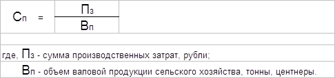 Себестоимость валовой продукции представляет собой сумму всех производственных затрат на ее получение. Себестоимость единицы продукции определяют как отношение производственных затрат к объему валовой продукции конкретного вида. Она рассчитывается по формуле: