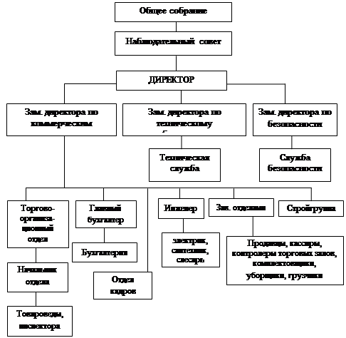 Как видно из схемы, над директором организации стоит наблюдательный совет, а главенствующим органом организации является общее собрание. Связь между генеральным директором и основными подразделениями ТД "Курасовщина" линейная, а затем подчинение происходит по функциональному признаку. Данный вид сочетает преимущества линейного и функционального типа, то есть представляет собой единство распорядительства и квалифицированное осуществление функций управления специальным аппаратом - администрацией.
