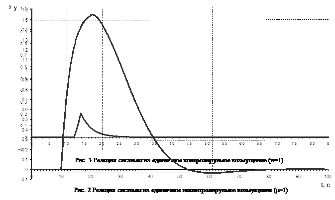 Реакция системы на единичное входное воздействие при данных настройках регулятора приведена на рис. 1. Реакция системы на единичное неконтролируемое возмущающее воздействие приведена на рис. 2. Реакция системы на единичное контролируемое возмущение приведена на рис. 3.