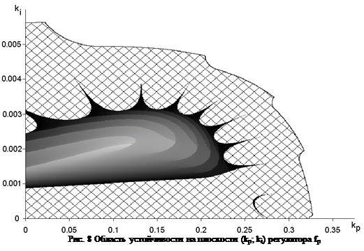 "Неровность" границы областей устойчивости связана с тем, что на интервале моделирования модуль ошибки регулирования расходящегося процесса "не успел" превысить заданную величину. На рис. 8 отображена область устойчивости на плоскости
