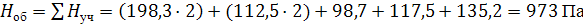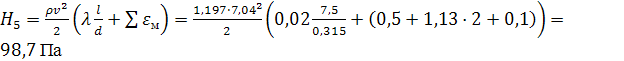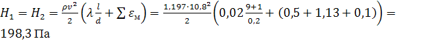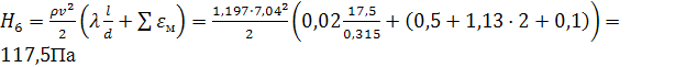 Здесь p=353/(273+23)=1, 197 кг/м- плотность воздуха при заданной температуре в помещении; λ =0,02 для воздуховодов из металлических труб; коэффициенты местных потерь напора приняты: ε =0,5 для жалюзи на входе; ε= 1,13 для колена круглого сечения при l = 900, ε=0,1 для внезапного расширения отверстия при отношении площади воздуховодов на последующем участке к площади воздуховодов на предыдущем участке, равном 0,7. Таблица 3.4.1)