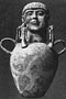 Характерно, что у подавляющего большинства глиняных голов VI века до н.э. подчеркнуто живые, глядящие широко открытыми глазами лица, как, например, на урне из Четоны, хранящейся в Археологическом музее во Флоренции. Лишь один раз, на урне второй половины VII века до н.э. из Солайи, мы видим действительно мертвое лицо, с плотно сомкнутыми глазами. Обычно же большие глаза с вырезанными зрачками оживляют эти крепкие, округлые или угловатые головы, прямо сидящие на слегка расширяющейся книзу шее. Крупные, грубоватые черты лица, большой нос, плотно сжатый рот с узкими губами хорошо сочетаются с жесткими волосами, переданными прямыми линиями, прочерченными в глине.