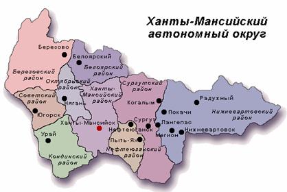 Центр округа - город Ханты-Мансийск. Расстояние от Ханты-Мансийска до Москвы - 2759 км. Расстояние от Ханты-Мансийска до Тюмени - 490 км.