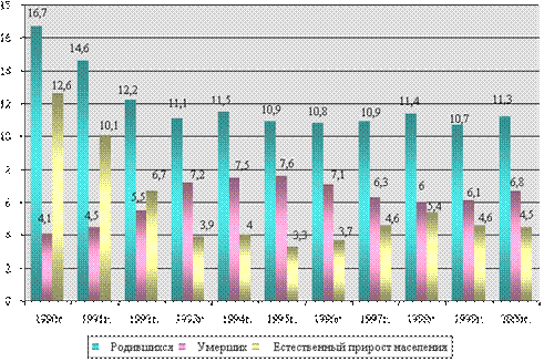 В 2000 году в Российской Федерации продолжился (начавшийся с 1992г.) процесс сокращения населения. Причем темпы снижения численности россиян на протяжении последних шести лет (1995 - 2000гг.) оставались достаточно стабильными и составили около 0,4% в среднем за год (500 тыс. человек). Определяющим фактором уменьшения остается естественная убыль, которая сохраняет устойчивый и долговременный характер.