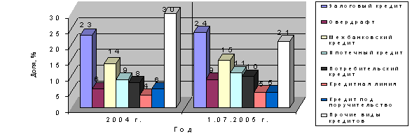 В последнее время особый спрос в кредитной системе приобретают такие ссуды, как овердрафт, трастовый кредит, ипотека, онкольный кредит, клиринг, кредитные линии, потребительские кредиты и т.д. (рисунок 2.1). Достаточно большую долю на кредитном рынке (21% в 2005 г. в общем, объеме обращаемых кредитов) занимает предоставление таких традиционных видов кредитов, как кредит под банковскую гарантию, залоговый кредит, кредит под поручительство третьих лиц, межбанковские кредиты и т.д.