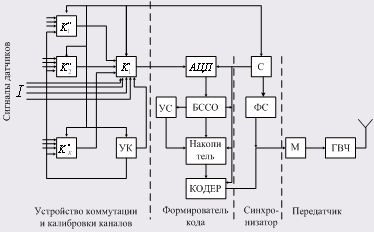Структура цифровой РТМС зависит от различных факторов: скрытности, помехоустойчивости, числа каналов, способа кодирования сообщений, системы сжатия данных, системы модуляции, методов синхронизации. Рассмотрим обобщенную функциональную схему бортовой аппаратуры цифровой РТМС (рисунок 1) с двухступенчатой модуляцией, здесь: БССО – бортовые системы сбора и обработки информации;