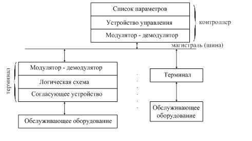 Терминал включает модем, логическое устройство, согласующее устройство. В модеме осуществляется модуляция и демодуляция сигналов. Логическое устройство производит предварительный анализ информации, а согласующее устройство – нормировку по амплитуде.