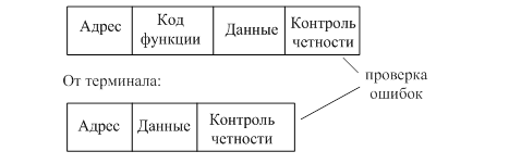 По сигналам программного устройства в соответствии со списком параметров производится обмен информацией между терминами и контроллером. Каждый терминал имеет свой адрес. Контроллер осуществляет обработку информации, поступившей от терминала, и задает порядок функционирования обслуживаемого оборудования. Формат данных, передаваемых между контроллером и терминалом изображен на рисунке 12.