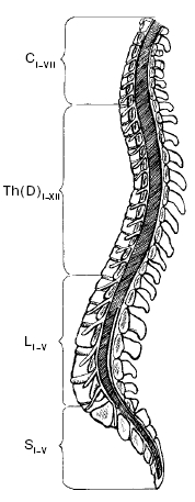 Головний мозок, що знаходиться в порожнині черепної коробки і складається з двох півкуль, ділиться на 5 відділів: довгастий, задній, середній, проміжний і кінцевий мозок. Від них відходять 12 пар черепно-мозкових нервів, функціональні показники яких разлічаются.Спінной мозок перебуває в хребетному каналі між верхнім краєм I шийного і нижнім краєм I поперекового хребця. Через міжхребцеві отвори по всій довжині від мозку відходить 31 пара спинно-мозкових нервів. Сегмент спинного мозку являє собою ділянку сірої речовини, відповідний положенню кожної пари спинно-мозкових нервів, що відповідають за надходження сигналів в ту чи іншу частину організму. Виділяють 7 шийних (CI-VII), 12 грудних (Th (D) I-XII), 5 поперекових (LI-V), 5 крижових і 1 куприковий сегмент (два останні об'єднують в крижово-куприковий відділ (SI-V)