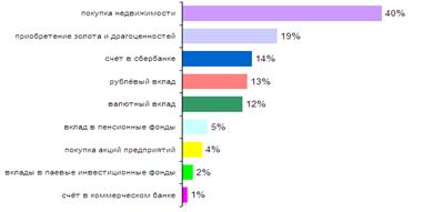 Так, несмотря на то, что популярность инвестирования в недвижимость с октября 2008 года с 51% снизилась до 40%, подобные вложения всё так же считаются выгодными и надежными среди сограждан. На втором месте по популярности оказалась покупка золота и драгоценностей (19%). Хранить деньги в банках, открывать рублёвые или валютные счета готовы около трети сограждан.