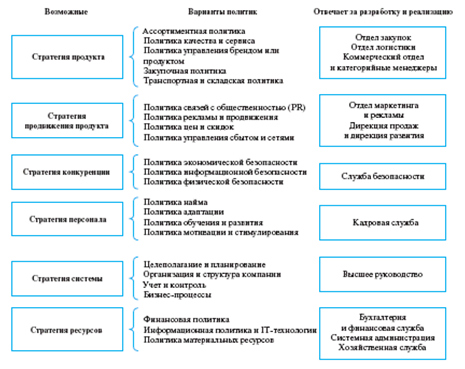 Необходимость стратегического подхода. На рис.1.1. показаны возможные составляющие общей стратегии компании и варианты различных политик, которые компания может осуществлять для своего развития. Здесь мы видим, что ассортиментная политика тесно связана с закупочной и логистической деятельностью и образует единую стратегию организации.