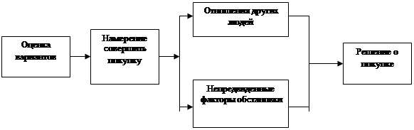 Оценка вариантов ведет к ранжированию объектов в комплекте выбора. У потребителя формируется намерение совершить покупку, причем наиболее предпочтительного объекта. Однако на пути от намерения до принятия решения в дело могут вмешаться еще два фактора. (Рис.6.).