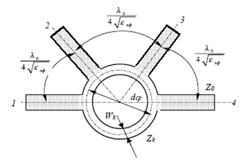Ширина полоски кольца Wк определяется аналогично ширине основной полоски. Для большей компактности мостовую схему можно выполнить в виде прямоугольника.