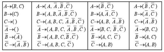 В четвертой колонке воспроизводятся записи третьей колонки, но при этом из правой части этих записей исключаются предикаты, образующие в совокупности с субъектом суждения, обратные тем, которые содержатся в CT-замыкании. Например, во второй строке из записи B®(A,