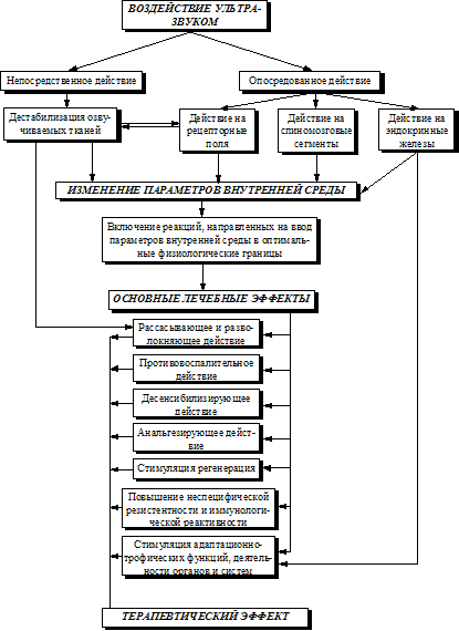 Механизм терапевтического действия ультразвука сложен и многогранен. Он складывается из местных и общих, нейро-рефлекторных и нейрогуморальных реакций, которые проявляются фазно и отличаются длительным последействием. При адекватно подобранных дозировках ультразвук оказывает болеутоляющее, рассасывающее, противовоспалительное, спазмолитическое, фибролитическое действие. Он ускоряет регенеративные и репаративные процессы, активирует крово- и лимфообращение. нормализует процессы обмена, улучшает функциональное состояние нервной и эндокринной систем. Из перечисленного видно, что диапазон влияний ультразвука на организм широк и это определяет возможность использования его для лечения многих заболеваний (3).